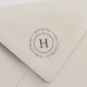 Design de endereço de retorno elegante apresenta o seu monograma inicial de solteiro no centro com uma borda de círculo pontilhada. Seu nome familiar e endereço residencial estão curvos por fora em letras clássicas.