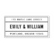 Na moda Return Address Rubber Stamp (Carimbo de Borracha de Endereço de Retorno) com nomes e endereços em fontes negrito entre uma borda de retângulo dividida. Perfeito para casais, casamentos, noivados e recém-casados. Agora você nunca mais precisa escrever seu endereço de novo. Personalize-o substituindo o texto do marcador de posição pelo seu nome e endereço. Para obter mais opções, como alterar a fonte, seu tamanho, espaçamento entre letras ou espaçamento de linha, clique no botão "Personalizar". *Observe que a Marca d'água do Zazzle que aparece na visualização de zoom NÃO aparecerá no produto impresso final. © Rosewood e Citrus