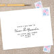 Este carimbo de endereço de retorno com autoimpressão chic apresenta um nome de script moderno e um tipo simples para o endereço. Use este selo para enviar os envelopes da resposta do casamento! Os carimbos de autoimpressão também são uma proteção de tempo de excelente ao tratar envelopes para coisas como cartões de natal, contas mensais e correspondência pessoal.