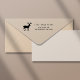 Um simples carimbo de endereço de retorno inspirado na natureza rústico, que inclui uma silhueta de um veado com galhadas e seu nome e endereço de família embaixo da tipografia moderna.
