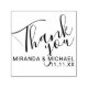 Carimbo de borracha para favores de casamento com texto 'Obrigado' em letra cursiva moderna com nome e data em fonte sans serif moderna.