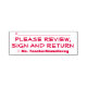 Este design de carimbo básico contém a mensagem "Please Review, Sign And Return" (Por favor, reveja, assine e devolva), juntamente com uma linha que permite a gravação de uma assinatura ou iniciais acima. Inclui também um nome de professor ou educador personalizável. Talvez pudesse ser usado por um professor, educador ou tutor para solicitar que o(s) progenitor(es) ou tutor(es) do(s) aluno(s) revisse o trabalho do aluno em um teste, papel ou outra tarefa.