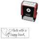 Um coração costurado com uma agulha de costura e uma mensagem de "Feita com um coração feliz" perfeita para uma pequena empresa de costura ou para um hobbista. Design original por Night Owl's Menagerie, 2022.