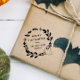 Caro selo de Halloween para os presentes de Halloween e favores de Halloween com Happy Halloween da sua família, escrito dentro a wreath of greenery, um fantasma e morcegos bonitos.