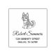 Imagem em tons de cinza de um cão rouco sentado com um sorriso feliz, língua para fora. Um simples lenço está amarrado em volta do pescoço.