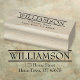 Um design de carimbo de borracha personalizado com duas regras destacando seu nome acima do texto do seu endereço de devolução.