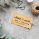 Carimbo de borracha para sua pequena empresa vendendo bens feitos à mão com escrita à mão em um roteiro de caligrafia onde corações entrelaçados separam as palavras para indicar que são feitos à mão com amor. Adicione seu nome ou nome comercial e site.