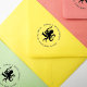 Carimbo de borracha de endereço de retorno no verso do envelope com polvo. O texto para nomes curva-se em torno da parte superior da imagem. O restante do endereço curva-se em torno da parte inferior. Muitas cores de tinta para escolher, e o carimbo vem em três tamanhos.