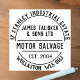 Peças de carro salvam o selo de borracha do pátio. Carimbo de Borracha de Salvação Motor. Nome da Empresa, Tipo de Negócios, mais Duas Linhas de Endereço em um efeito circular. Um carimbo de empresa para todos os tipos de artigos de papelaria, envelopes, embalagens, etc. Coloque seu endereço de retorno de forma fácil e elegante. Carimbo de borracha do pátio.