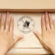 Este elegante selo de borracha "feito à mão com amor" apresenta uma agulha de costura com nome personalizado.