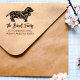 Este selo de borracha do "Basset Hound" contém um cesto decorado com nome e endereço da família.