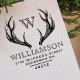 Adicione personalidade e estilo aos seus envelopes e cartões de férias com o nosso estilo de veados rusticage desenhado à mão. O estilo gravado cria um estilo de vintagem natural rústico. Personalize com seu monograma inicial, nome e endereço de retorno da família. Toda a trabalho de arte contida nesta família de veados vintage antlers monograma retorna o endereço de autoimpressão são arte original desenhada à mão pela Moodthology. Você pode personalizar o tamanho do texto, a fonte e o layout para sua própria preferência de design pessoal.