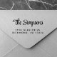 Um carimbo de endereço de retorno moderno personalizado que apresenta o seu nome num script de na moda e o seu endereço em uma simples tipografia.