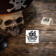 Uma ilustração branca e negra charmosa de um navio pirata, cheio de crânio e ossos cruzados nas suas velas e bandeiras. A nave tem uma arte detalhada de linha, mostrando seu casco, mastros e buracos. Este selo encarna perfeitamente o espírito aventureiro e rebelde dos contos piratas.