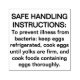 A FDA exige que todas as caixas de ovos com casca que não tenham sido tratadas para destruir Salmonella carregar a seguinte declaração de manipulação segura: INSTRUÇÕES DE MANIPULAÇÃO SAFE Para evitar doenças de bactérias: manter ovos refrigerados, cozinhar ovos até que as gemas estejam firmes e cozinhar comidas que contenham ovos cuidadosamente. 2025