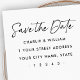 Carimbo de borracha de endereço de retorno elegante com o texto "Salvar a Data" em uma fonte elegante de script. Abaixo está seu nome e endereço de retorno.