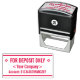 Este respeitável design de carimbo contém a mensagem "SOMENTE PARA DEPÓSITO", além de um nome e número de conta personalizados. Talvez pudesse ser usado por um funcionário de escritório ou um proprietário de uma pequena empresa para adicionar eficientemente um despejo restritivo a um cheque.