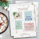 Entrega Especial de Quentes Desperta o cartão de Natal com selos de correio antigos, em azul verde-vermelho e bege, decorado com um saco, cones de pinho, bagas de inverno e palavras festivas (Deixem-no nevar, Feliz Natal e, Joy Hope Peace Acredite no Natal). A modelo está configurada para personalizar um dos carimbos e adicionar seu nome e logotipo. Os selos de postagem sentam-se sobre um padrão de fundo de árvores de natal em bege natural. Por favor, procure na minha loja designs semelhantes, com e sem fotos.