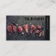 O Cartão de visita de Carnes Cuts Butcher mostra os pedaços de carne do açougueiro com faca e garfo na mesa de concreto. O nome comercial e o serviço ou um slogan estão no canto superior direito. A faixa preta à direita destaca o serviço que complementa a cor preta do nome comercial e a cor de fundo, criando um design minimalista e moderno.