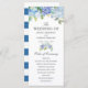 Um único cartão de programa de casamento com tema floral azul, adaptado especificamente ao seu futuro casamento. O verso apresenta listras elegantes de branco e azul. Todos os elementos deste item são desbloqueados e personalizáveis usando a função de personalização. Aproveite ser criativo e fazer seu.