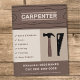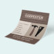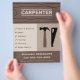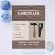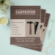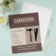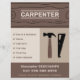 Folheto com o texto Carpinteiro escrito sobre fundo de madeira, e à esquerda, ilustração de martelo e serra, tudo em tons beges. Incluindo também os contatos e uma lista de cheios de serviços. Perfeito para o profissional do setor da madeira, como o carpinteiro, o armário, a construção de madeira, etc.