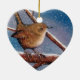 Minha pintura pastel do óleo de uma carriça pequena empoleirada em um ramo nevado com os flocos de neve que caem toda ao redor.
