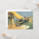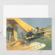 Ilustração vintage vitoriana de viagem e transporte futuristas de ficção científica com design steam punk apresentando um carro conversível voador com asas. O motorista está prestes a pousar seu carro futurista (ou é um avião) na loja de varejo de chocolate no futuro. Um design clássico de quadrinhos retrô de ficção científica.