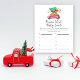 Um belo carro vermelho em uma aquarela e carregares estilo lápis e uma árvore de Natal. Celebre o grande dia com "Carro de Árvore de Natal". Chá de fraldas de inverno. Itens correspondentes disponíveis.