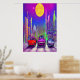 Um carro vermelho, roxo e azul dirigindo na rua da cidade à noite com uma lua de cheio e céu estrelado limpo. Esta é uma arte gerada por IA.