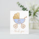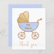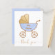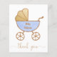 Obrigado seu filho chá convidados com este obrigado bonito e econômico que você apresenta uma coloração azul pastel e dourada de uma carruagem de bebê retrô e "obrigado você" escrito em um roteiro de na moda que coordena com o ouro da carruagem. Na frente, você pode personalizar o texto na carruagem (nome do bebê, "Obrigado", "É um menino!" ou deixar vazio); no verso, você pode personalizar facilmente seu obrigado sua mensagem e assinatura.