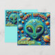 Uma foto de Carson, a alienígena amigável, que está visitando para celebrar o aniversário de Carson. As saudações no cartão são "Feliz Aniversário Carson". Na parte traseira da placa há uma pequena versão da mesma imagem. Há muito espaço para escrever uma mensagem. Feito com a ajuda do Bing.