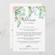 Esta colorida carta de boas-vindas ao casamento floral tropical é perfeita para um casamento moderno. Os design ilustram flores brancas, amarelas, cor-de-rosa, pinceladas com lindas folhas verdes de cor aquosa, inspiradoras elegância. Personalize a frente com uma mensagem de boas-vindas para seus convidados e seus nomes. Personalize as costas com a programação de eventos e outras informações úteis.