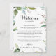 Esta carta de boas-vindas à caligrafia tropical é perfeita para um casamento moderno. A design apresenta folhas tropicais predominantemente verdes com um toque de flores rosadas. Personalize a frente com uma mensagem de boas-vindas para seus convidados e seus nomes. Personalize as costas com a programação de eventos e outras informações úteis.