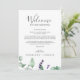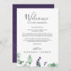 Estas cartas de boas-vindas e cartas itinerárias são perfeitas para um casamento simples e elegante ao ar livre. O design floral apresenta folhas de cor aquosa de eucalipto e verde com espinhos de flores silvestres roxas. A frente da carta apresenta uma carta de boas-vindas e a parte de trás da carta apresenta o itinerário do casamento. Estas notas são perfeitas para casamentos de destino e bolsas de boas-vindas de hóspedes.