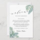 Compartilhe uma mensagem de boas-vindas para seus convidados de casamento tropicais ou de beachside, bem como um itinerário ou calendário dos eventos do fim de semana. Frente apresenta sua mensagem bem-vinda, destacada com frentes de palma verdes delicadas nos cantos. Personalize o reverso com o dia do casamento ou o itinerário do fim de semana do casamento. Perfeito por incluir nas bolsas de boas-vindas do hotel ou entregar aos quartos dos seus convidados.