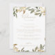 Esta carta de boas-vindas de casamento outono verde-ouro é perfeita para um casamento moderno. A design apresenta uma fascinante folhagem artística verde e dourada. Personalize a frente com uma mensagem de boas-vindas para seus convidados e seus nomes. Personalize as costas com a programação de eventos e outras informações úteis.
