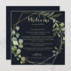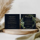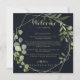 Esta carta de boas-vindas a um casamento verde-azul de ouro geométrico é perfeita para um casamento simples. A design apresenta lindas folhas verdes pintadas manualmente em um fundo azul escuro, enfeitando uma armação geométrica dourada. Personalize a frente com uma mensagem de boas-vindas para seus convidados e seus nomes. Personalize as costas com a programação de eventos e outras informações úteis.
