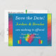 Um design simples, porém elegante, que coloca as informações importantes em destaque de uma forma fácil de ler. O fundo sólido bordeado por um toque de cor de arco-íris torna esse cartão postal difícil de ignorar na caixa de correio! Escolha qualquer cor que você goste para o fundo (mostrado aqui com um azul desbotado na frente e branco no verso). O verso é pré-formatado tanto para o endereço de retorno quanto para o do destinatário. Se você preferir escrever à mão seus Save the Dates, simplesmente deixe os campos de endereço do destinatário em branco. Use os campos de modelo fornecidos para personalizar rapidamente com suas informações. Clique em "personalizar ainda mais" para alterar a fonte, o tamanho, as cores e as posições.