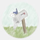 No pastel desenhando neste adesivo, um pássaro azul tem uma carta para enviar. O pássaro pequeno está segurando um envelope com seu bico, sentado em cima de uma caixa de correio de cinza que está montada em um posto de madeira. A caixa de correio fica, inclinada, em grama verde contra um céu azul pálido. Da minha imagem original criada digitalmente.