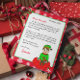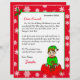 Adicione o nome do seu filho a esta carta personalizada de Papais noeis. Elfo bonito sentado num saco de brinquedos. Coloração de página no verso.