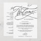 Estas cartas de boas vindas e cartas itinerárias românticas são perfeitas para um casamento simples. O clássico design moderno apresenta espirais ricos e turbilhões brancos com magnífica e elegante tipografia à mão. A frente da carta apresenta uma carta de boas-vindas e a parte de trás da carta apresenta o itinerário do casamento. Estas notas são perfeitas para casamentos de destino e bolsas de boas-vindas de hóspedes.