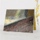 雪の降る中、キャンドルの温かい火と眠っている犬が見える窓辺を描いたカード。