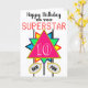 Feliz 10º aniversário para você. A idade 10 é escrita em letra branca aberta na frente e dentro em texto vermelho na página. Personalize para qualquer idade. Mande um amigo para o aniversário deles. Superstar é escrito em letra vermelha pontilhada. Um salto de cor super-herói em cor rosa profunda, verde, azul-céu, amarelo, vermelho, estrela de triângulos geométricos. Dentro com velas coloridas de aniversário. Arte original e Design de verso de placa © TamiraZDesign.