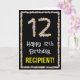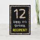 A frente desta divertida e inspirada no jardim, design de cartões de saudação com tema de aniversário, mostra a mensagem "Feliz 12 de Aniversário", junto com um nome de destinatário personalizado. O grande número "12" mais a borda na frente ambos apresentam ícones de flor. O dentro apresenta uma mensagem de saudação de aniversário personalizada, ou talvez possa ser apagado e deixado o vazio se uma mensagem for escrita manualmente. Um cartão floral, personalizável de saudação de aniversário como este pode ser enviado para comemorar o décimo segundo aniversário de alguém. [~Z0000648]