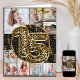 Cartão de aniversário personalizado de 15 com 9 fotos personalizadas e balões de folha de papel leopardo em preto e ouro. O modelo está pronto para carregar 9 das suas fotos favoritas que são apresentadas numa colagem de fotografias em formatos quadrados e retratos. Suas fotos cercam os balões de impressão de animais, que são decorados com confete preto e ouro. Você também pode adicionar um dentro de mensagem - ou pode deixar o vazio dentro se preferir escrever manualmente na chegada.