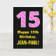 Este design de cartão de saudação de aniversário alegre e divertido apresenta um grande número "15" com uma rosa claro e um padrão de listras cor-de-rosa escuras contendo formas cardíacas na frente. A frente também apresenta a mensagem de saudação de aniversário "Feliz Aniversário de 15", e um nome de destinatário personalizado. O dentro apresenta uma mensagem de saudação de aniversário personalizada, ou talvez possa ser apagado e deixado o vazio se uma mensagem for escrita manualmente. Um cartão de aniversário personalizado como este pode ser uma maneira divertida de enviar desejos de aniversário a alguém que comemora seu décimo quinto aniversário. [~Z0000434]