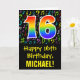 A frente deste design de cartões de saudação divertidos, coloridos e vibrantes, com tema de aniversário, apresenta um grande número de "16", tendo um padrão inspirado na gradação do espectro do arco-íris. Também apresenta a mensagem "Feliz 16.º aniversário", e um nome de destinatário editável. A frente também apresenta um padrão de várias notas e símbolos de música com várias cores e tamanhos. O dentro apresenta uma mensagem de saudação de aniversário personalizada, ou talvez possa ser apagado e deixado vazio se uma mensagem for escrita manualmente. Um cartão de aniversário personalizado como este pode ser uma maneira divertida de celebrar o décimo sexto aniversário de alguém. [~Z0000420]