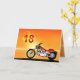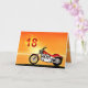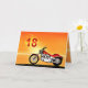 Uma moto semelhante a um Harley parado ao lado do mar com um glorioso pôr do sol laranja. Um cartão de excelente para qualquer pessoa que goste de bicicleta e motocicletas. Veja toda a gama de cartas para idades e relacionamentos na minha loja. Todos os direitos de autor da trabalho de arte Norma Cornes