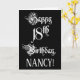 A frente deste design de cartões de saudação de aniversário opulente e elaborado apresenta a mensagem "Feliz 18.º Aniversário," em texto de estilo de script luxuoso, num fundo de cor preta. O dentro tem uma mensagem de saudação de aniversário personalizada, ou talvez pudesse ser apagado e deixado vazio se uma mensagem fosse escrita manualmente. Um cartão de saudação de aniversário, editável como este, poderia ser enviado para celebrar o décimo oitavo aniversário de alguém. [~Z0000554]