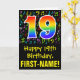 A frente deste design de carta de saudação de aniversário divertida, vibrante e colorida apresenta um grande número "19" com um padrão inspirado no gradiente do espectro arco-íris, juntamente com a mensagem "Feliz 19.º Aniversário", e um nome de destinatário editável. A frente também tem um padrão de várias notas e símbolos de música com várias cores e tamanhos. O dentro apresenta uma mensagem de saudação de aniversário personalizada, ou talvez possa ser apagado e deixado o vazio se uma mensagem for escrita manualmente. Um cartão de aniversário como este pode ser uma maneira divertida de enviar desejos de aniversário a um músico, cantor, compositor, ou a outra pessoa que comemora seu décimo-nono aniversário. [~Z0000420]